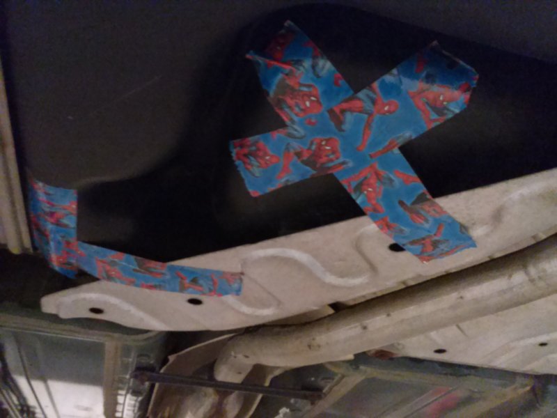 Spiderman duct tape. It actually was holding pretty well, but I removed it because I thought I heard it hitting the exhaust pipe.