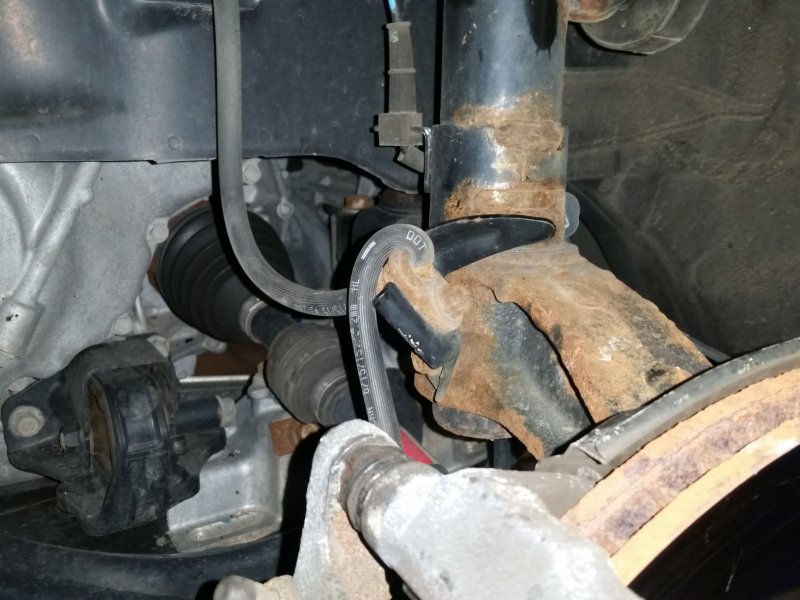 The car came into my shop because the left front caliper seemed to be seized. When I went to check it, I found that the brake hose had gotten twisted, and because it was pulled tight and kinked with the caliper on, the fluid couldn’t return when the brake pedal was released, causing the brakes to be stuck. When you remove and reinstall a caliper, make sure you haven’t spun it around and twisted the hose in a way that will cause problems like this.
