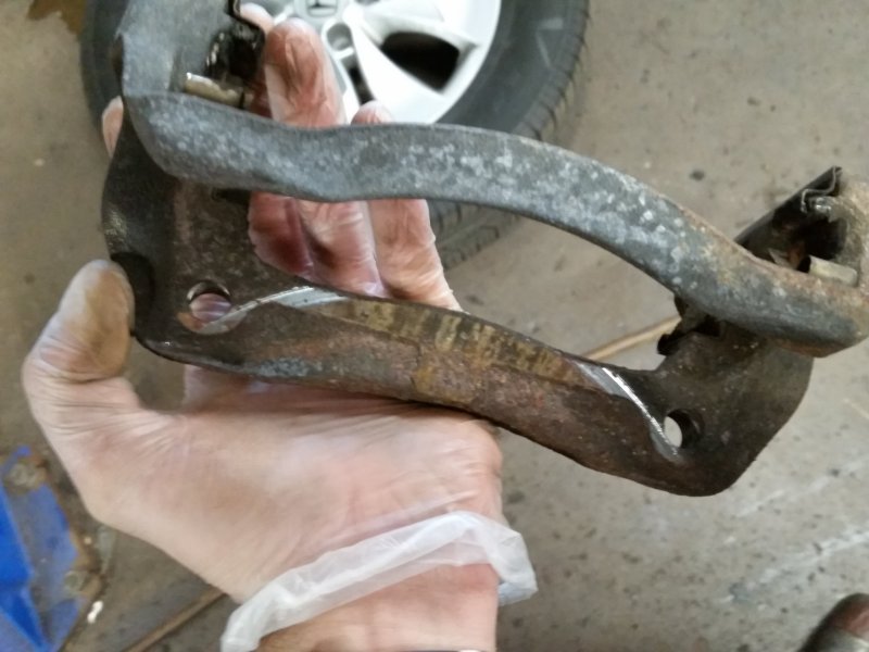 Another classic case of an owner not paying attention as their brake pad wears away completely and falls out, leading to the caliper grinding down against the rotor. It’s definitely been this way for a while, and it should never have gotten this far.
