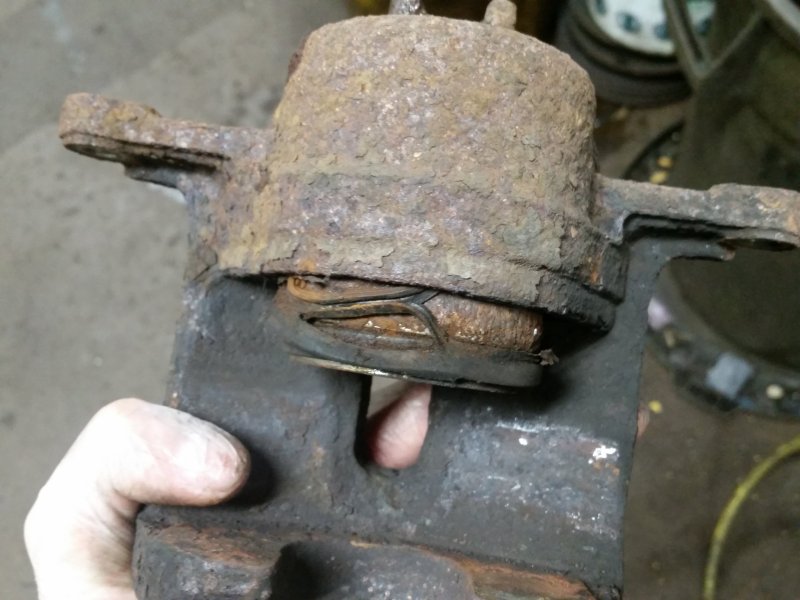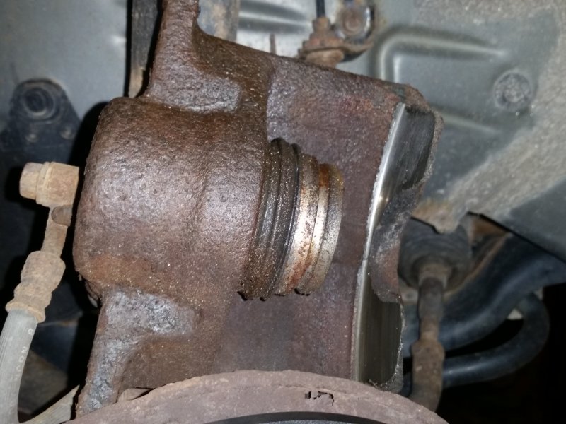 And finally, a seized caliper piston likely due to the dust boot getting torn, allowing water in, rusting the piston and preventing it from retracting.