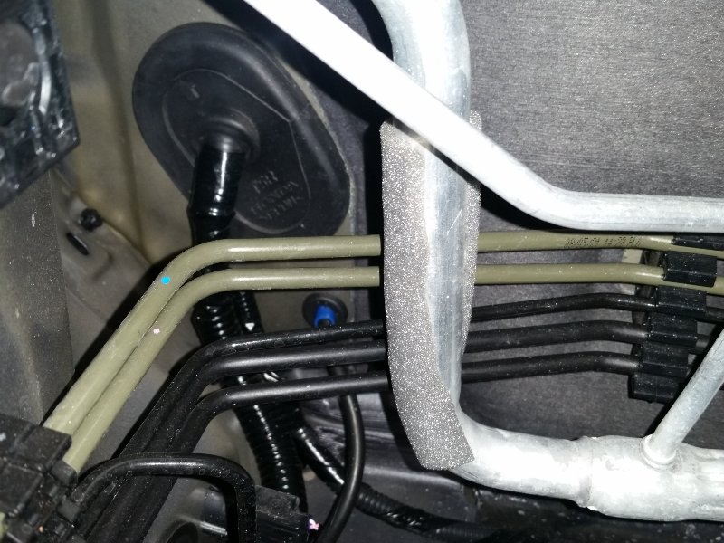 After I couldn’t locate the noise, I went for a ride with the service manager, and after he heard the sound, we went back in and started looking more. We opened the hood just to make sure it was nothing in the engine bay, and he happened to notice that the A/C line was rubbing against the brake lines. Because the A/C lines run through the firewall to the condenser in the dashboard, the vibration sound was getting transmitted right into the center of the dashboard. We adjusted the lines so they wouldn’t touch, and I had some foam tape that I wrapped around the A/C line just in case they touched again.
