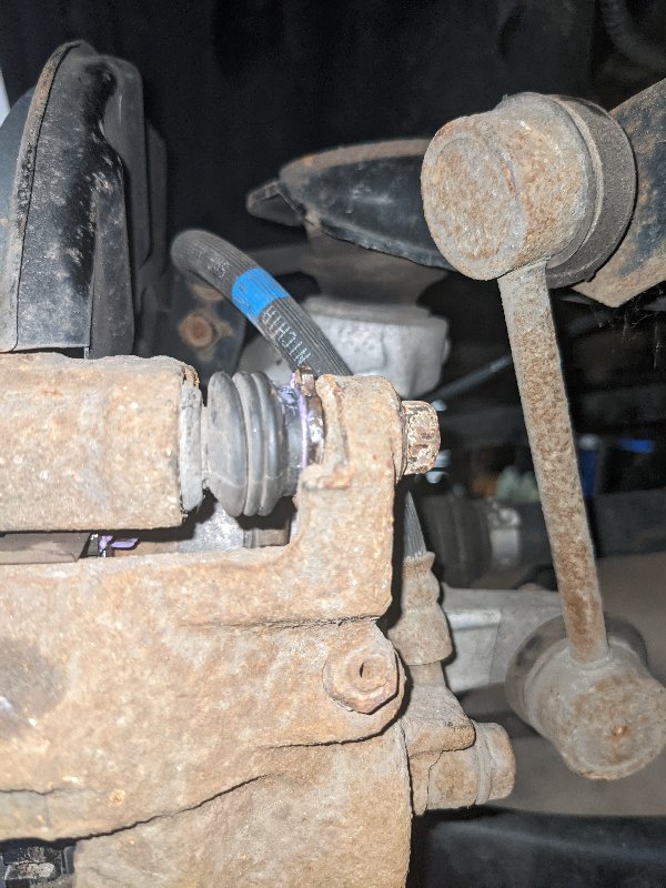 It’s not the easiest to see in a picture, but the caliper itself is bent where the slider and bolt go together. A clue to what could’ve caused it is the broken off bleeder screw on the caliper, so it looks like something must have somehow hit the caliper, even though the wheel fits pretty close to it.