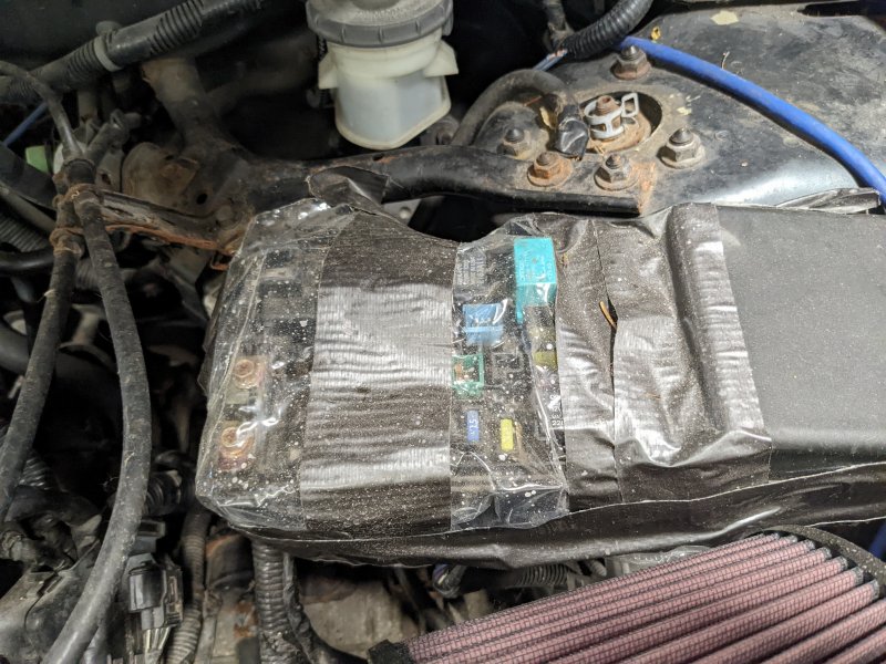 Once in the shop, I opened the hood to hook up my battery charger so I could program the key, and found their hack job of a fuse box cover. I guess if it keeps water off it then it’s better than nothing. I programmed the key, and replaced one of the airbags that was under recall, and found that the airbag system warning light was on. It had a code for failure of the SRS unit, which is an expensive thing to replace, and with the condition of the car, it’s not worth it.