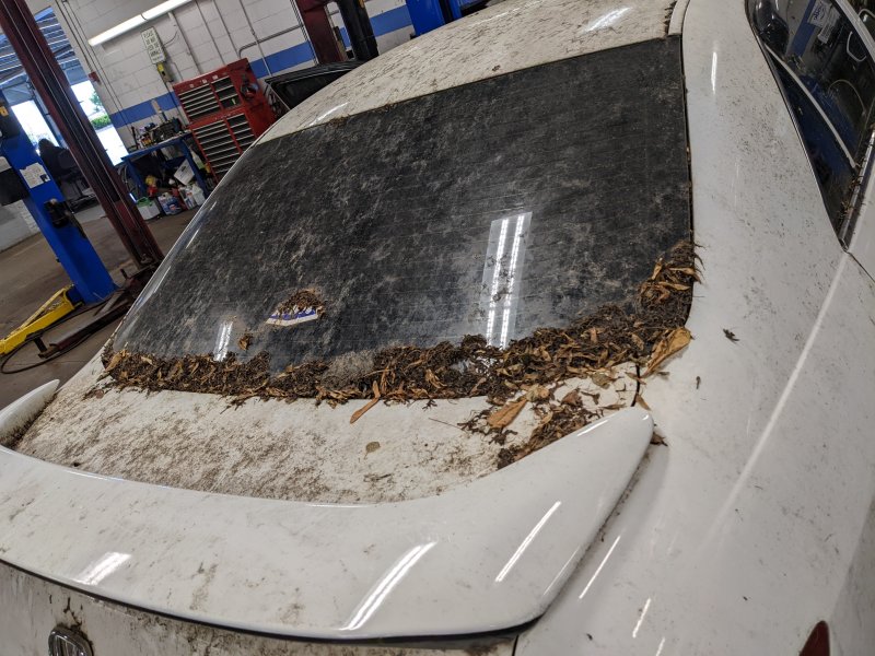 As you can tell by all the dirt and leaves on the car, it’s definitely been sitting for a while. The flat tires and dead battery are also a good indication of that. It wasn’t immediately obvious, but the car wasn’t originally white. It got painted at some point, and there was overspray everywhere, including over the VIN label on the driver’s door jamb, so it was a very lazy job, whoever did it.