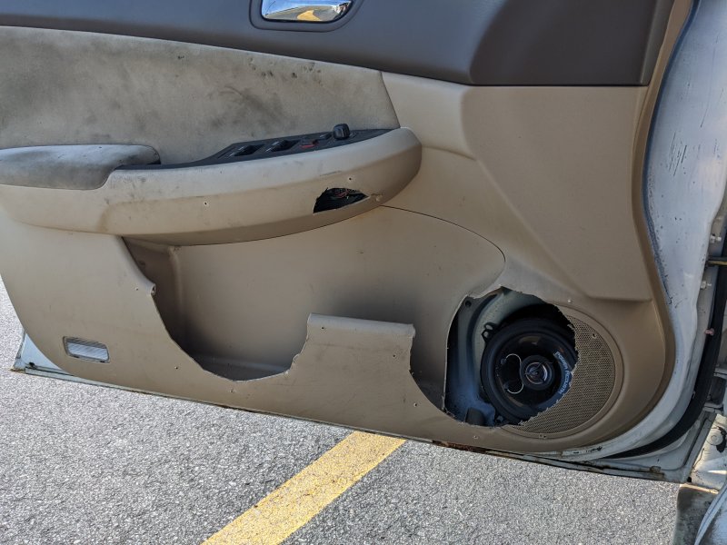 I could tell that there had been an aftermarket audio system at one point. There was a gaping hole in the dashboard where the unit probably was, and the door panels were all hacked up where speakers had been installed. The rear shelf behind the rear seats was completely gone.