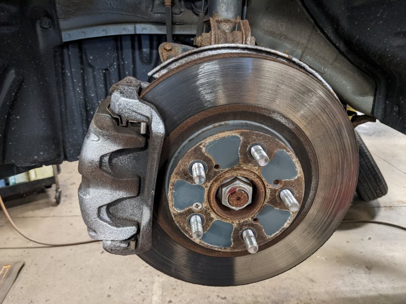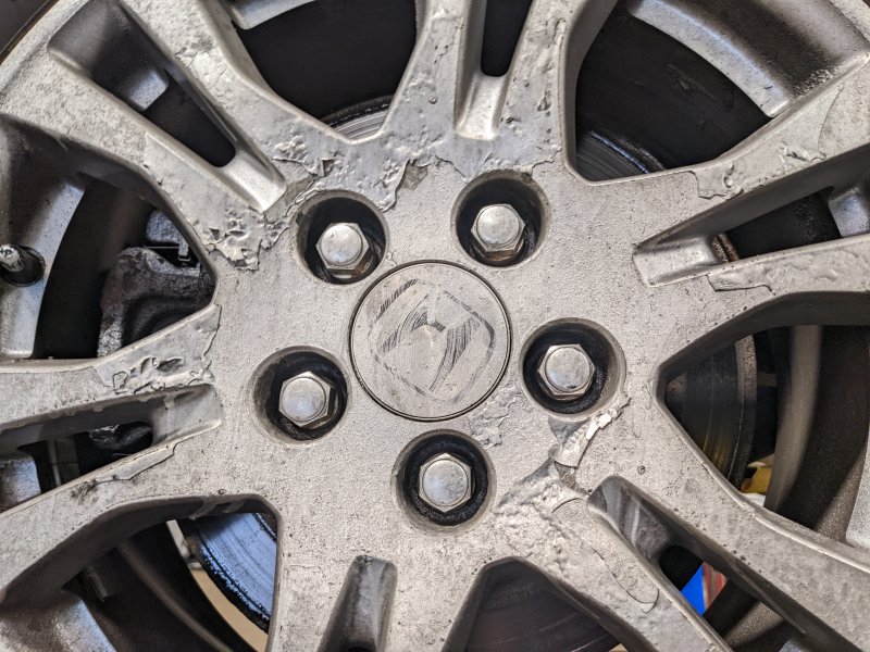 As many alloy wheels become as they get older, the wheels had a lot of corrosion and the finish had been coming off, so somebody decided to do a cheap “fix” and just spray paint them, right over all the peeling finish. They also didn’t bother to remove the wheels, so the brake rotors and calipers were striped with silver paint where the wheels didn’t shield them from the spray.