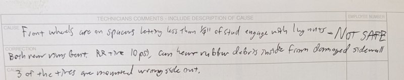There was so little stud left for the lug nuts due to the spacers that I couldn’t go even two full turns by hand before the lug nuts were snug to the wheels. That means that there’s barely anything holding the wheels on. It should be obvious why that’s unsafe. I made sure to document on the repair order, both the physical copy and on the computer, that the car was not safe with the wheel spacers.